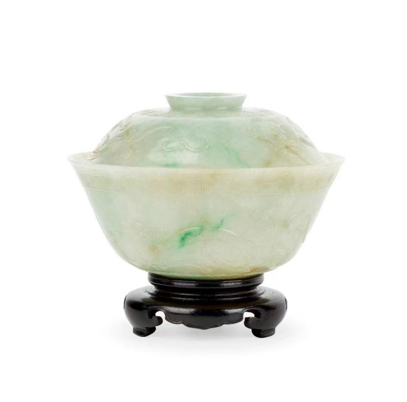 翡翠整挖螭龙纹盖碗(带座)H 8 cm D 12.6 cm