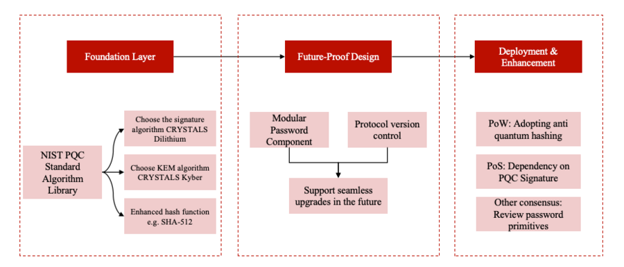 漏洞响应与算法迭代:与全球后量子安全研究机构建立联动机制,及时获取最新算法漏洞信息;若发现当前所用算法存在安全隐患,依托架构的模块化设计,无需重构底层框架,仅替换加密与共识模块即可完成算法升级,确保架构始终适配最新的抗量子安全标准,长期抵御量子计算威胁。