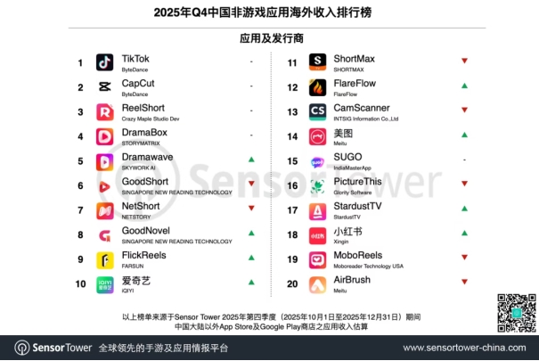 1月14日,2025年Q4中国非游戏应用海外收入排行榜发布,字节跳动、美图、小红书等公司旗下产品登榜,美图秀秀(Meitu)、AirBrush进入TOP 20。
