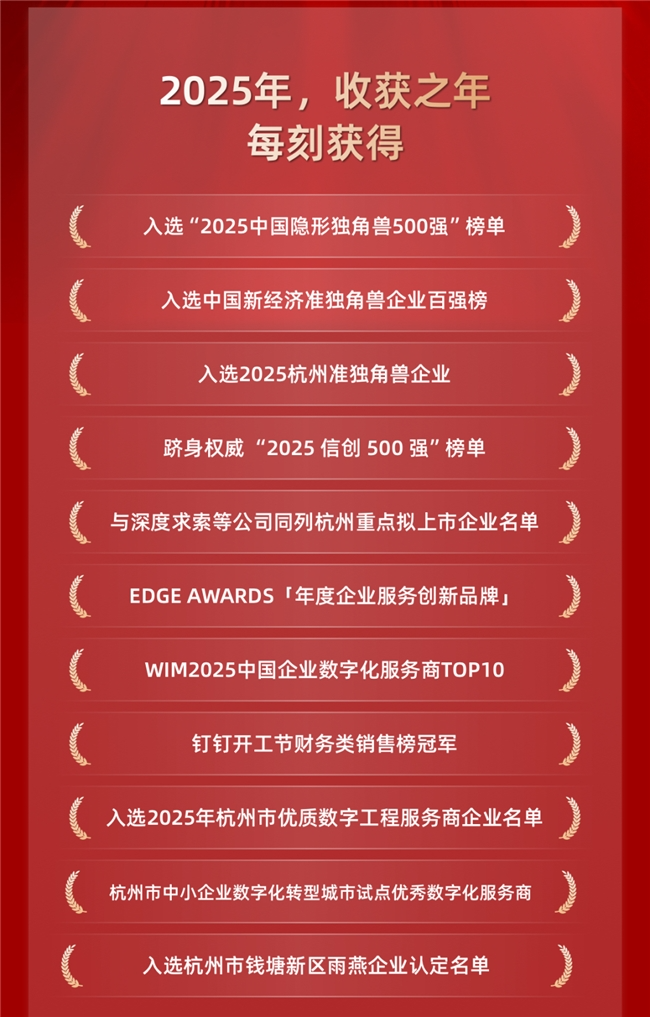2025年,收获之年,每刻亮眼的市场表现,获得了行业的广泛认可。每刻先后入选2025杭州准独角兽企业、2025中国隐形独角兽500强等榜单,跻身权威的“2025信创500强”,还拿下了EDGE AWARDS「年度企业服务创新品牌」、WIM2025中国企业数字化服务商TOP10等多项荣誉;同时被认定为杭州市优质数字工程服务商、中小企业数字化转型优秀服务商,更在钉钉开工节上斩获财务类销售冠军。这些荣誉,既是对每刻科技过往成绩的肯定,也寄托着行业对其未来发展的期待。