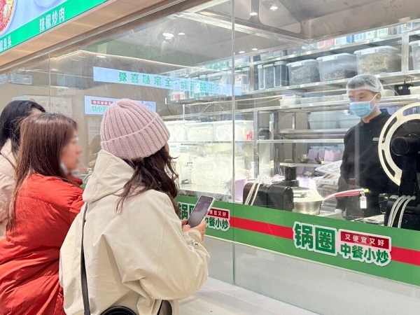 不远处,几位刚下班的顾客正在扫码点餐。三分钟后,他们将从取餐窗口接过热气腾腾的现炒菜肴,享受科技带来的便捷与美味。