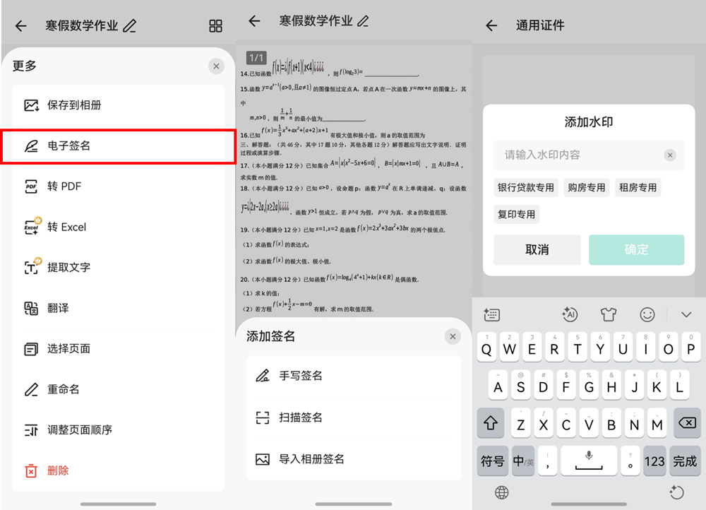 鸿蒙版扫描全能王不仅已支持扫描文档和证件、智能提取文字、试卷还原、格式转换、文档管理等学习过程中常用的功能,还在近期上线了电子签名、为扫描的证件添加水印等功能。在处理文档时,可通过“更多-电子签名”为各类学习文件、证书及表单添加签名,支持手写、扫描、从相册导入等便捷添加方式。在扫描考证时所需的证件时,也可添加自定义水印,防止泄露隐私。