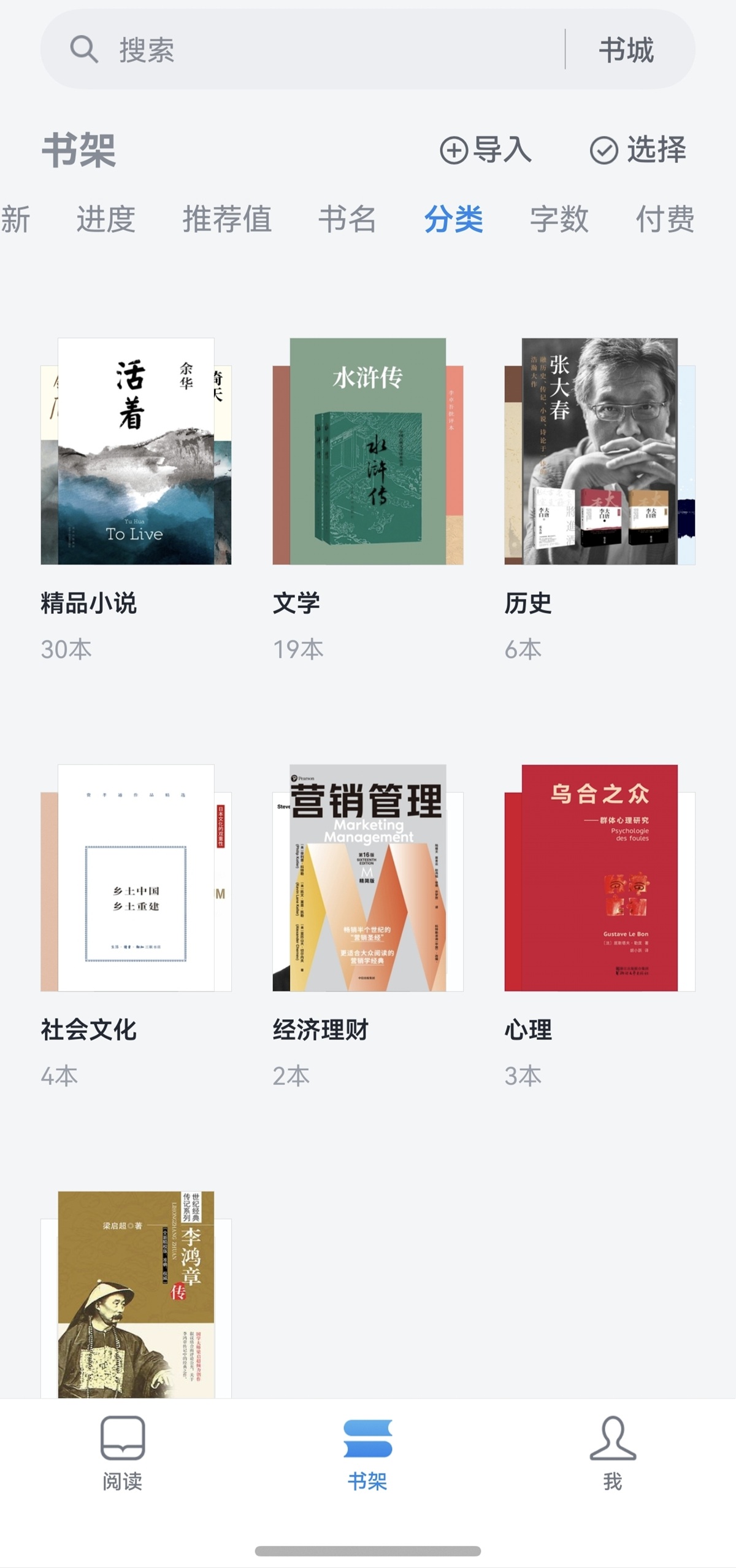 • 书架分组:支持按小说、文学、历史书等类型分类,杂乱书架瞬间井然有序,找书不盲目。