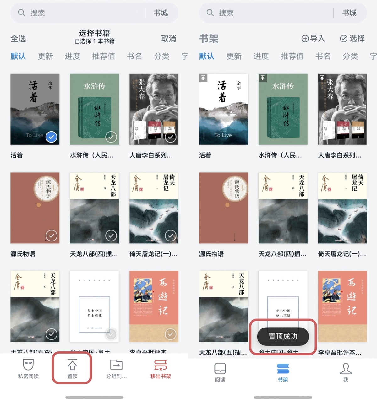 • 书籍置顶:把常看的书放在最顶部,不用每次往下翻找,一键开读,省时又高效。