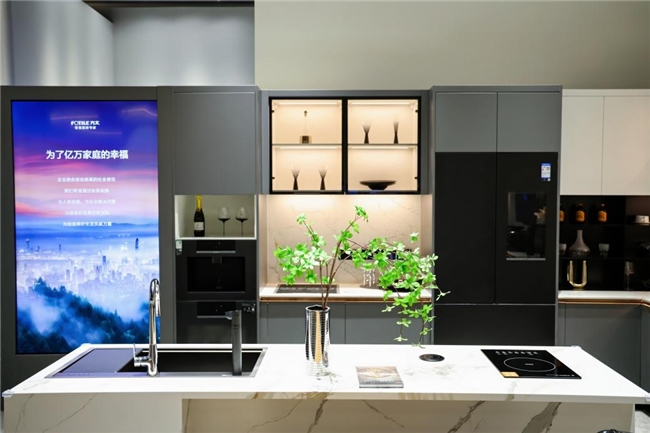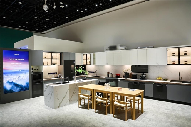 其中,由方太主导打造的“智慧厨房”空间是展览的焦点之一。以“家庭社交中心”为核心理念,打破传统烹饪者独自劳作的封闭格局,将岛台置于家的中央,让灯光、厨电、操作台形成开放流畅的动线,让烹饪不再是一人独行的辛苦劳作,而是家庭情感交流的“烟火中心”。