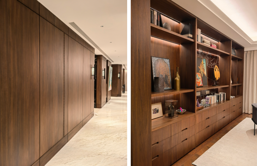 此般对话感,由外至内,自然蔓延。步入室内,空间设计秉持对“自然感”的追求与对简素生活本真的回归。柏厨家居参与打造的护墙板,呈现出原生般的“原木”视感,木饰面连贯的色彩与形态,为空间赋予了承载艺术的无限想象。这里的设计,并非效仿历史之形,而是以当代精神的理性笔触,自然生长出能够跨越时间的生活质感。