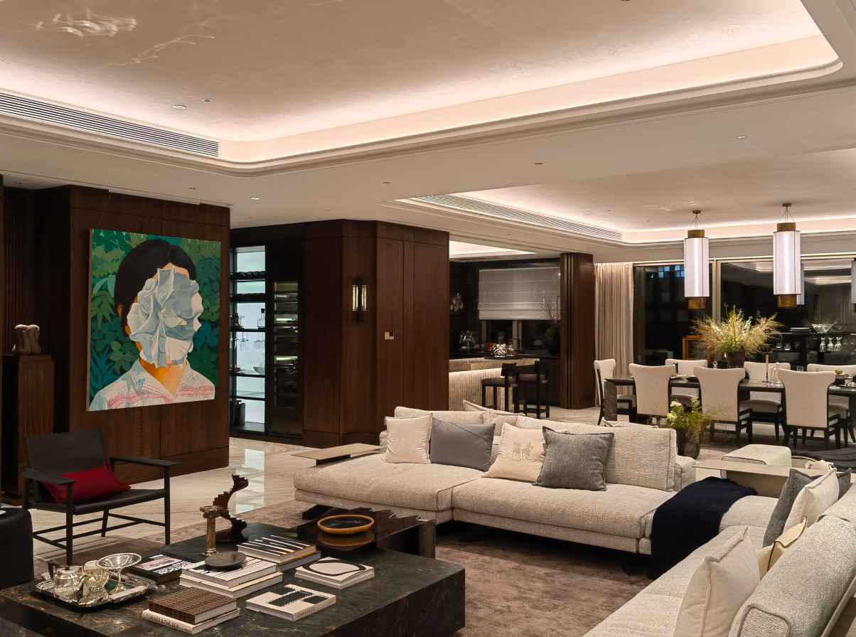 西厨作为纵向空间的视觉焦点,以简洁线条与精致质感提升着整体格调。临窗的餐边柜,不仅是艺术的陈设,更通过取放杯盏的日常仪式,实现着室内外场景的微妙互动;西厨吧台的融入,则丰富了生活的社交剧本——晨咖晚酒,烟火与诗意在此刻交融。