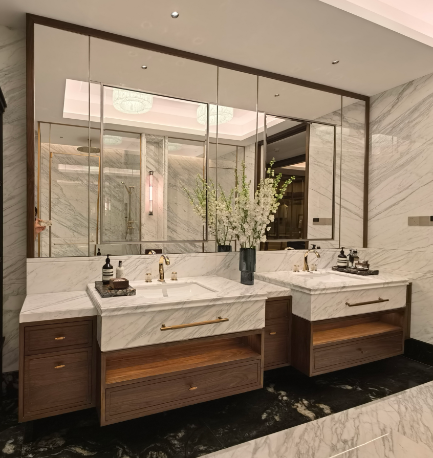 主卫空间中,柏厨家居设计的双台盆与雅致色调,与广阔的景观窗相映成趣。让晨昏洗漱的日常,亦能成为愉悦心情的起点,真正将“以人为本”的设计,嵌入生活的每一个褶皱之中。