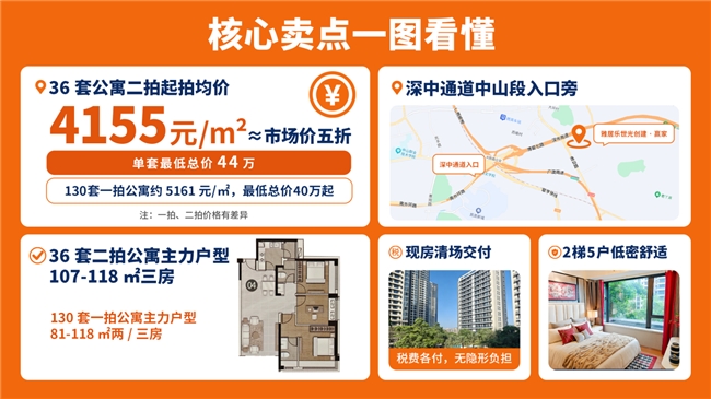 2026年4月29日10时,中山赢家36套公寓将在京东拍卖平台启动二拍,起拍均价仅约4155元/㎡,折价率约为市场二手房挂牌均价的50%。另有130套一拍公寓(最低总价40万起)上拍时间待定,建议提前关注,锁定先机。