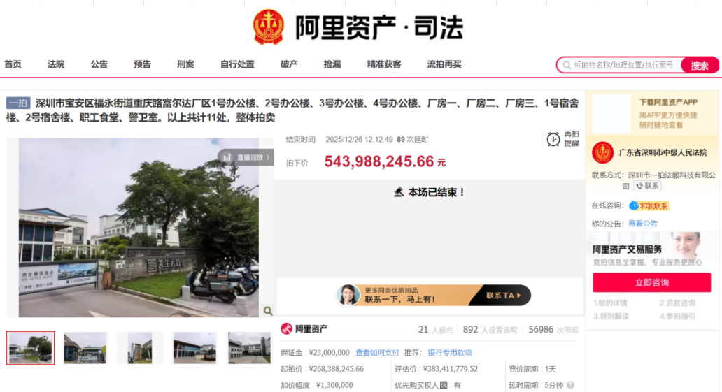 2025年12月26日12时,由广东省深圳市中级人民法院负责的标的“深圳市宝安区福永街道重庆路富尔达厂区1号办公楼、2号办公楼、3号办公楼、4号办公楼、厂房一、厂房二、厂房三、1号宿舍楼、2号宿舍楼、职工食堂、警卫室。以上共计11处,整体拍卖”终于落槌,经过两个多小时的激烈角逐,实现超高溢价成交!