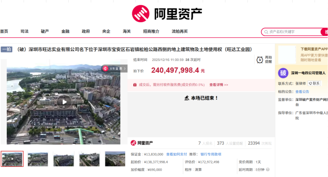此前2025年12月16日11时,深圳市旺达实业有限公司名下位于深圳市宝安区石岩镇松柏公路西侧的地上建筑物及土地使用权(旺达工业园)在阿里资产平台顺利成交。