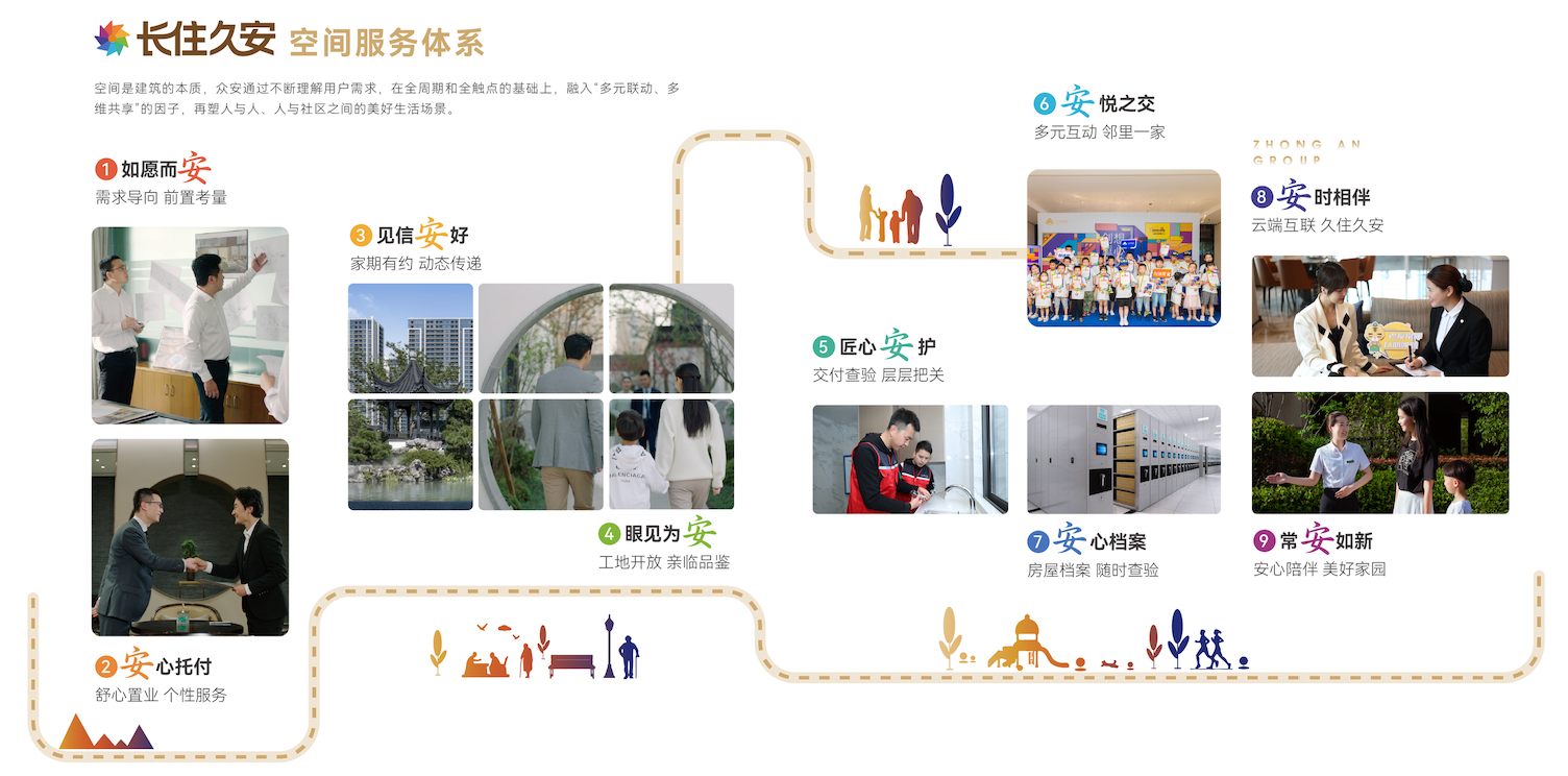 众安的解法,是构建「长住久安」空间服务体系。关键在于前置与嵌入:客服团队在项目定位阶段便介入,参与客户共创访谈,将需求反馈给设计;智慧生活服务板块,早在销售阶段就已明确未来的服务内容、标准与触点。