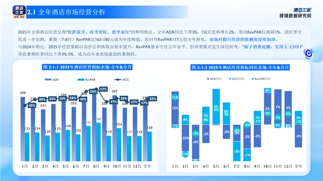 在经营方面,2025年中国酒店市场在消费理性回归中走出“价跌量升、旺季更旺、淡季更淡”的独特轨迹:全年ADR同比下降3%,OCC逆势增长2%,RevPAR仅微降1%。“以价换量”成为贯穿全年的主线,但表面平稳下暗藏结构性分化:市场对假日经济的依赖度持续加深,淡旺季分化进一步加剧。同线级各城市与同城市分档次的酒店市场吸纳与价格质量能力结构分化显著。