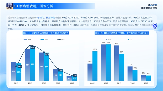 在消费端,近三年酒店消费群体结构呈现"年轻化、性别分化"特征:90后(33%-37%)和80后(29%-30%)仍是消费主力,合计贡献超六成;00后占比从2023年15%升至2025年20%,成为增长最快的群体,显示用户结构加速年轻化。从性别差异看:90后男女各占33%,消费场景最均衡;00后女性(27%)显著高于男性(16%),主导轻旅行、网红打卡等新兴需求;80后男性(32%)占比更高,反映商务差旅及家庭决策中的主导性;70后、60后性别分布相对平衡。