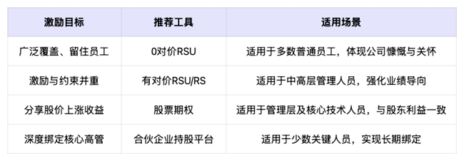 RSU的核心特点包括:其一,授予时无需员工出资,员工承担的风险较低,接受度普遍较高;其二,归属后员工获得的是真实股份,享有完整的股东权益;其三,适用场景广泛,既可用于广泛覆盖普通员工,也可用于重点激励核心人才。