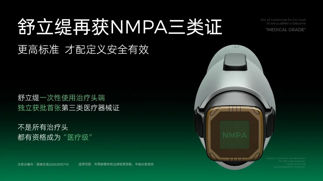 在监管重塑行业格局的关键节点,YOUMAGIC舒立缇再次以“合规先行者”之姿实现突破。在主机设备已持有NMPA三类医疗器械注册证的基础上,治疗头也正式获批国家药品监督管理局(NMPA)三类医疗器械注册证,注册证编号为国械注准20263090749,此证让舒立缇率先步入精细化合规阶段,成为能从根源解决治疗头入院、备案、收费等全流程合规的医械品牌,为行业合规化树立了新标准。