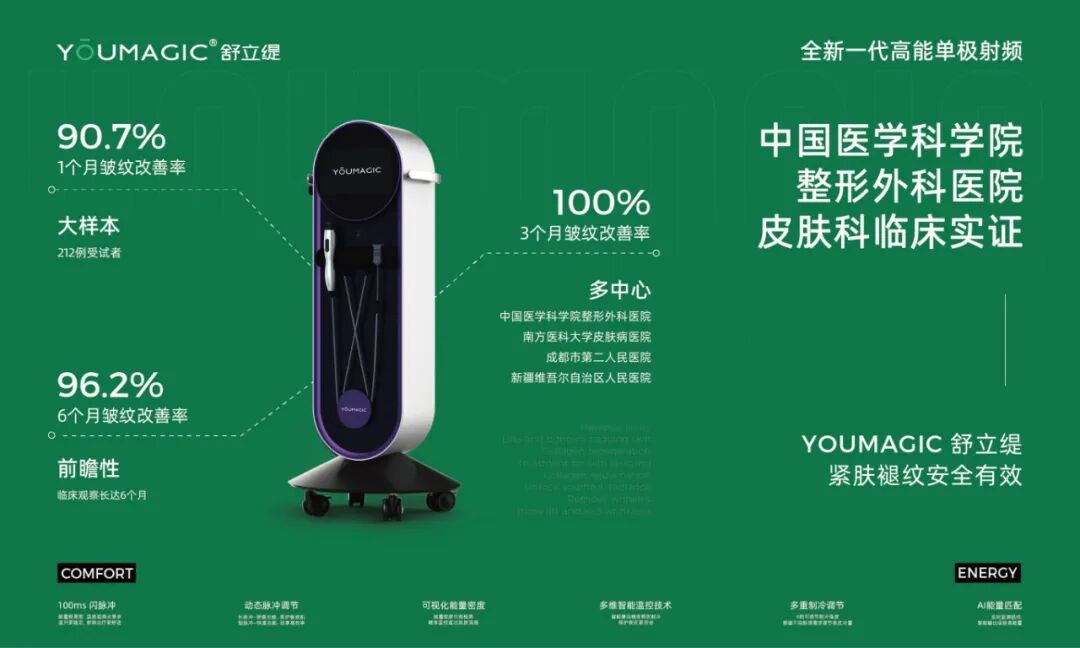 这张证的背后,是实打实的临床数据支撑。中国NMPA对三类医疗器械的监管严苛程度堪称全球之最,根据《射频美容设备注册审查指导原则》要求,厂商必须在中国境内开展前瞻性、多中心、大规模、随机对照的临床试验。舒立缇按照这一标准完整走通了注册路径。已联合中国医学科学院整形外科医院、南方医科大学皮肤病医院等4家知名中心,完成了212例受试者的多中心临床试验。临床研究显示,用舒立缇治疗后3个月,皱纹改善有效率达100%,6个月效果维持率96.2%,且治疗后未出现严重不良现象。全面证实了治疗头的生物安全性、能量释放稳定性与临床有效性。