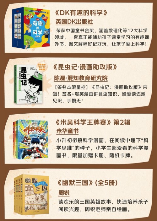想要给孩子购买新的课外读物,那么11月“新书月刊”的这几本图书可以参考。《DK有趣的科学》涵盖数学、物理、化学、生物等12大科学领域,十个分册交叉覆盖到基础科学和应用科学的多个领域,文本轻松有趣、图片精彩高清、设计富有视觉冲击力,适合孩子阅读,还荣获中国童书金奖,适合作为辅助孩子课堂学习的有趣课外书。初中的家长可以给孩子准备《昆虫记:漫画助攻版》,帮助孩子读透八年级语文需要整本书阅读的《昆虫记》,预热、精读、总结能帮助孩子读懂原著,还备有《重点知识图解》手册和《真题练习与图解》手册,有助于搞定考试,同时到京东可限量抢签名本。小升初的家长可以为孩子购买《米吴科学王牌赛》第2辑,覆盖四大学科知识,漫画让孩子学起来不费劲,并在阅读中埋下“科学思维”的种子,限量加赠卡册、随机卡牌。著名儿童文学作家周锐老师带来《幽默三国》(全5册),以游戏的笔法改写三国故事,快速培养孩子阅读兴趣。
