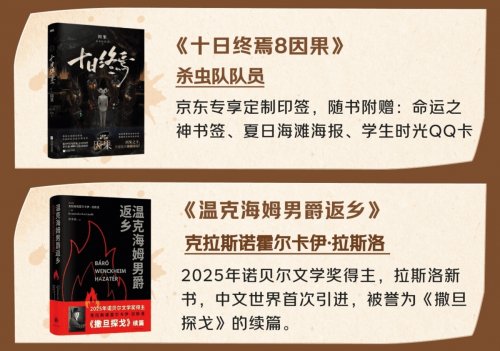 放松休闲时,很多读者选择看小说,11月“新书月刊”带来《十日终焉8因果》和《温克海姆男爵返乡》。其中,番茄小说2024年度巅峰榜第一作品《十日终焉》系列,9.9分高评,杀虫队队员的《十日终焉8因果》是不少忠实读者的必购佳作,非常适合喜欢悬疑幻想类题材的读者,同时,京东下单赠专享定制印签,随书附赠命运之神书签、夏日海滩海报、学生时光QQ卡。2025年诺贝尔文学奖得主克拉斯诺霍尔卡伊·拉斯洛的《温克海姆男爵返乡》,为中文世界首次引进,被誉为《撒旦探戈》的续篇,以寓言审视东欧社会,以黑色幽默构造末日狂欢,并由著名翻译家余泽民担纲翻译,值得一看。